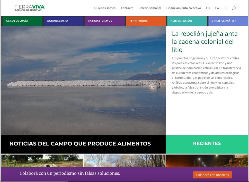 Agencia Tierra Viva is a cooperative media outlet that was formed in 2019 at the initiative of historical organizations in the countryside: the Union of Land Workers (UTT), the National Indigenous Peasant Movement (MNCI-Somos Tierra) and the Federation of Federated Cooperatives (Fecofe), three key actors in pursuit of food sovereignty. Through its website (www.agenciatierraviva.com.ar), social networks and digital newsletters, the Agency takes advantage of its development and territorial insertion to produce informative content on a daily basis and with federal criteria: research notes, analysis columns, interviews and photo galleries. The agency is made up of a group of communicators, photographers, designers, illustrators, who interact with more than a dozen popular communicators from the three organizations (UTT, Fecofe and MNCI-Somos Tierra). At the same time, Tierra Viva maintains links with more than 50 communicators from all over the country and a dozen popular media that feed the information agency and in turn feed on it for their own agendas. The birth of the medium is specifically linked to the absence in Argentina of a news agency with these characteristics, that reports on issues related to the agri-food model from the perspective of small producers, and that makes family-peasant-cooperative agriculture visible. Tierra Viva Agency makes visible those “other fields” that throughout the country generate work and produce healthy, safe and sovereign food for the domestic market, as opposed to a model designed exclusively to export commodities without taking into account the social, environmental, health and economic consequences. Its work in photojournalism stands out, linked to providing real content to various journalistic media about current events in the field. In 2022, they received a Mention in Photojournalism from the “Whale/Freedom Project”.