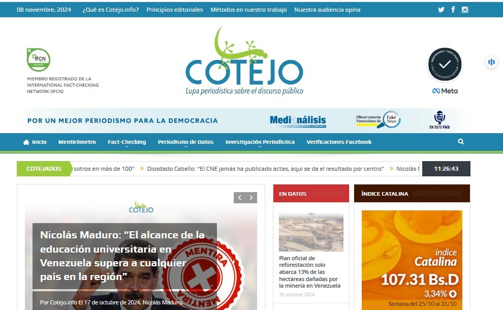 Cotejo is the first fact checking initiative in Venezuela founded on June 27, 2016. It is a project of the civil association Medianalisis that studies and promotes democratic and independent journalism in Venezuela. Cotejo analyzes and unmasks public discourse and contributes with better information for Venezuelans. “We want to make visible how the government lies, how it falsifies data, its own data, because it is information that they provide and then contradict each other,” explains Andrés Cañizález, one of the founders of this initiative that operates in the interior of the country, in the city of Barquisimeto, 280 kilometers west of the country's capital. As indicated in its name, this digital medium seeks to contrast, review, and compare the public discourse of actors and institutions. This project that arose in conversations with the Medianalisis Civil Association, dedicated to consultancy that generates good journalistic practices, enriches the informative proposal by incorporating data journalism to talk about issues as current and sensitive as the diaspora. "Given that there are no official figures in Venezuela and that many spokespersons, including the attorney general, deny that there is an exodus, when one of the media outlets we monitor publishes official data in a certain country, we make a note about that country." Colombia displaced the United States as the first country that received the most Venezuelans in 2017, it was one of the first analyzes of the #CotejoDiaspora section. They also have a database of Murdered Women.  Among the highlighted sections is the Catalina Index, which evaluates the rate of inflation weekly by following the increase in the price of a Catalina (a type of sweet bread) and a café con leche, a traditional snack of the region. The Regional Matches are maintained where the public discourse of the different regions of the country is analyzed; Brief Comparisons, for chronicles and news that unmask public discourse on political, economic, health, food and education issues. In-depth Comparison: Data journalism and fact checking that highlight the problems that affect the country. Due to the opacity of data in Venezuela, Cotejo privileges the use of databases from international organizations, NGOs and universities in the country in their investigations. From there they build their own databases. Cotejo.info works in networks with journalists and alliances with regional and national media to expand information dissemination. They have a Director and a Deputy Director, a General Editor, an Editorial Coordinator, a Web and Content Administrator and a social media manager.
