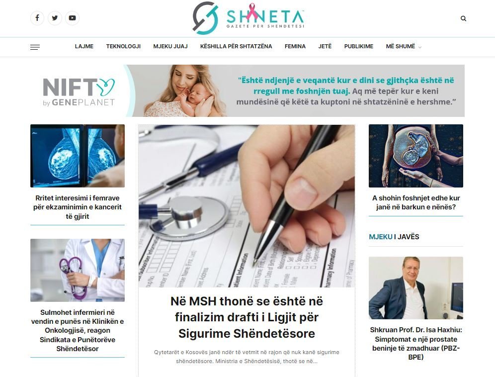 It is a platform where citizens can find not only information, but also professional health advice. Health tips are distributed through its social media channels. In addition to its main Facebook page, Gazeta Shneta, it has three other pages: Këshilla për Shtatëzënat, Bota e Bebeve, and Statezania dhe Bebet.