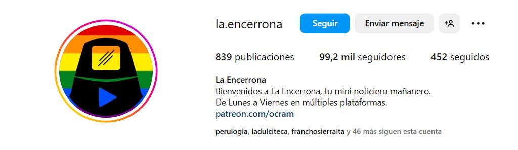 Daily podcast (Monday to Friday) with current news about Peru. In 20 minutes your listeners will be ready to start the day. It is broadcast on multiple platforms. Aimed at a literally captive audience, on March 16, 2020, Marco Sifuentes began broadcasting La Encerrona on his social networks, an independent mini-newscast that, like a kind of antiviral, dedicated itself to combating fake news and disinformation circulating in cyberspace related to the coronavirus pandemic. But in a world of misinformation bubbles, confirmation biases and personalized content, the only possible response is journalism, in that sense La Encerrona went on to discuss all kinds of topics. The morning mini-newscast is divided into three blocks: FIRST BLOCK: Today's story. An opinion, an explanation or a renegade on the topic of the day. SECOND BLOCK: The headlines that are viral or that should be. News with context. THIRD BLOCK: Recommendations for life, support for community causes, peace of mind. The moment of the hug. In addition, they generate content for social networks and on weekends, opinion columns.