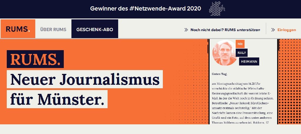 On Sundays, it publishes an opinion piece written by six to eight rotating authors, closely intertwined with the city's history and its present. RUMS won the Netzwende Award for sustainable media innovation in 2020.